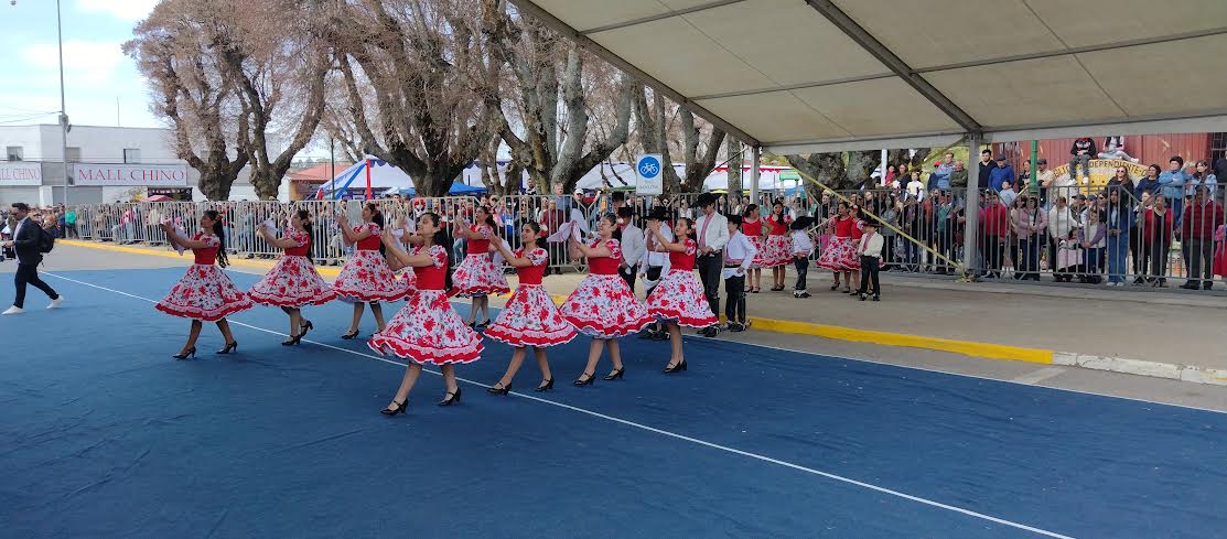 El colorido y la alegría no se hicieron esperar cuando comenzaron los bailes tradicionales. Parejas de jóvenes  se movieron con gracia al ritmo de la cueca, la música que nunca puede faltar en Fiestas Patrias. Los pañuelos ondeaban en el aire, mientras los bailarines giraban y zapateaban con energía, arrancando vítores de la multitud. Entre los aplausos, se realizó el tradicional brindis con chicha en cacho, un momento de pura chilenidad. Algunos tomaban a sorbos pequeños y ceremoniosos, mientras otros lo hacían con más entusiasmo, sosteniendo el cacho con ambas manos para no dejar ni una gota.